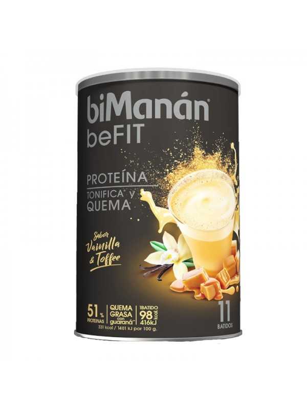 Bimanan Befit Proteína Sabor Vainilla & Toffe 330 G. Batido hiperproteico en polvo, para hacer un delicioso batido sabor vainilla y toffe. Ideal para ayudar a mantener y aumentar la masa muscular, cumpliendo tus objetivos con un aporte de proteína extra
