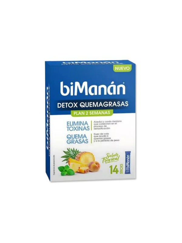 Bimanan Detox Quemagrasas Plan 2 Semanas es un complemento alimenticio que combina extractos vegetales como abedul, cardo mariano y nuez de cola para favorecer la eliminación de toxinas, acelerar el metabolismo y ayudar a quemar grasa de forma natural, todo con un agradable sabor tropical y en un práctico formato bebible.