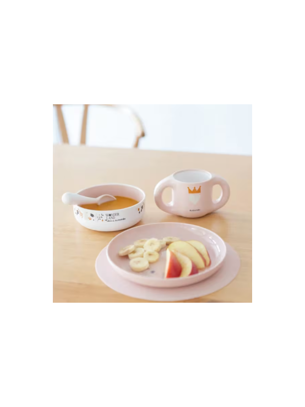 Vajilla compuesta por plato llano y bol de gran capacidad, taza con grandes asitas que facilitan su agarre, cuchara ergonómica ideal para papillas y potitos y mantel antideslizante que evita que el plato se mueva.