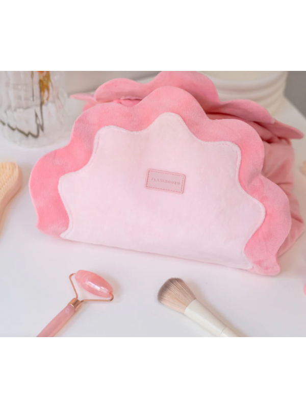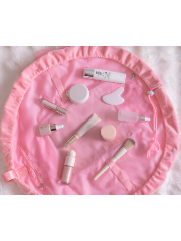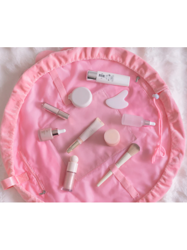 Neceser de maquillaje y cosmética color rosa estilo bolsa con cordón ajustable. El accesorio perfecto para irte de viaje, ya que puede abrirse por completo para tener a la vista todo su contenido.