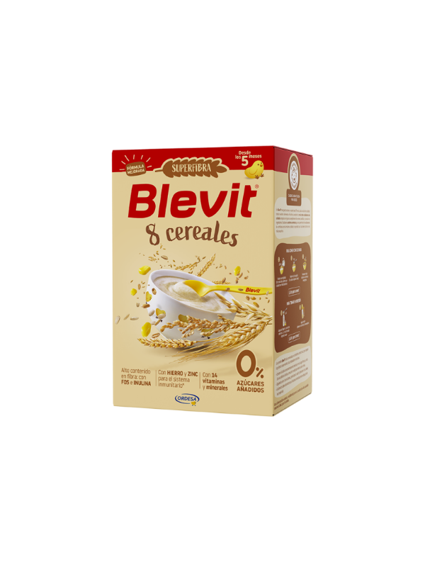 Blevit Superfibra 8 Cereales cuenta con un 90% de cereales (trigo, arroz, maíz, centeno, avena integral, trigo sarraceno, espelta, cebada), además aporta vitaminas, minerales y un alto contenido en fibra. También tiene un alto contenido de calcio, hierro y zinc.