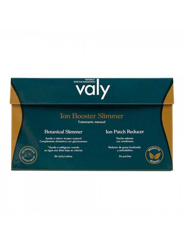 Valy Ion Booster Slimmer es un tratamiento para la pérdida de peso que se compone de 84 sobre con sabor a cacao y aptos para veganos, que ayudan a reducir el peso corporal acompañado de una dieta baja en calorías y 56 parches reductores con iontoforesis que reducen la grasa localizada y tienen función anticelulítica. Botanical Slimmer es un complemento alimenticio con glucomanano el cual es una fibra obtenida de la raíz de la planta asiática Konjac, Amorphophallus konjac.
