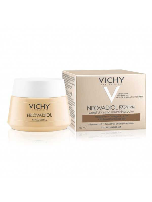 Vichy Neovadiol Magistral es un bálsamo especialmente pensado para todas las mujeres tras la menopausia que desean luchar contra los efectos de la post menopausia en su piel como son la pérdida grave de densidad, la fragilidad y la sequedad de la piel. Este bálsamo tiene una tecnología única de reconstrucción tisular y aceites vitales reconstructores. Esta innovación ha sido posible gracias a una asociación única de activos: