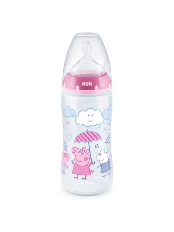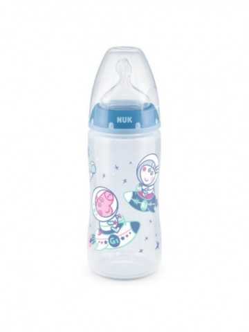Biberón Nuk versión Peppa Pig de 300ml con tetina Flow Control que permite a los bebés controlar el flujo cuando están bebiendo. Para niños de 6-18 meses.