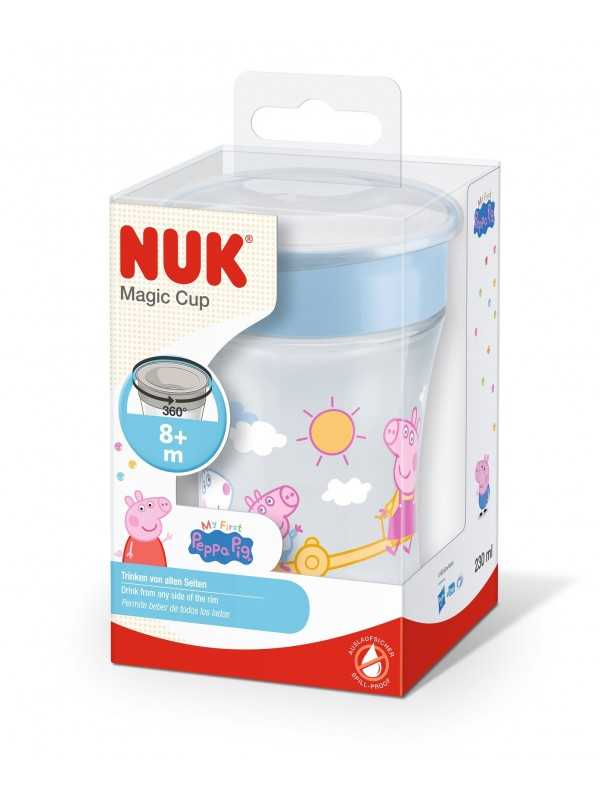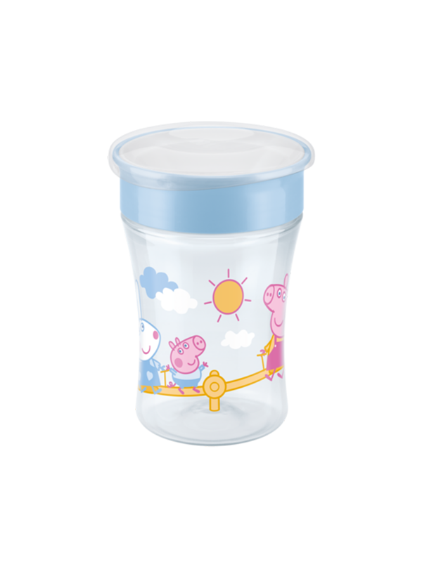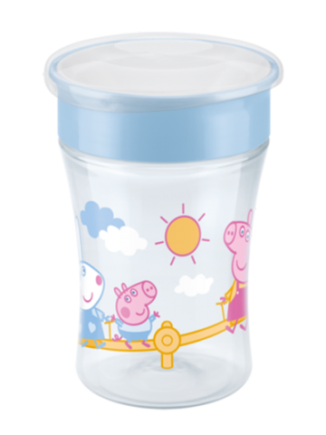 El biberón Magic Cup de Peppa Pig es un Vaso de aprendizaje con borde de 360º cuya forma única del borde del vaso permite beber fácilmente desde todos los lados. Tiene una salida de aire integrada para un flujo de bebida ininterrumpido.