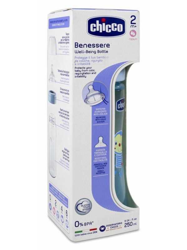 Chicco biberón Benessere Well-Being es un biberón con el que se puede prevenir la aparición de cólicos, reflujos o posibles irritaciones, de forma natural desde su alimentación. Ésto lo consigue, creando un flujo alimenticio regular. Este biberón ha sido fabricado con un vidrio de clase superior, higiénico y completamente seguro.