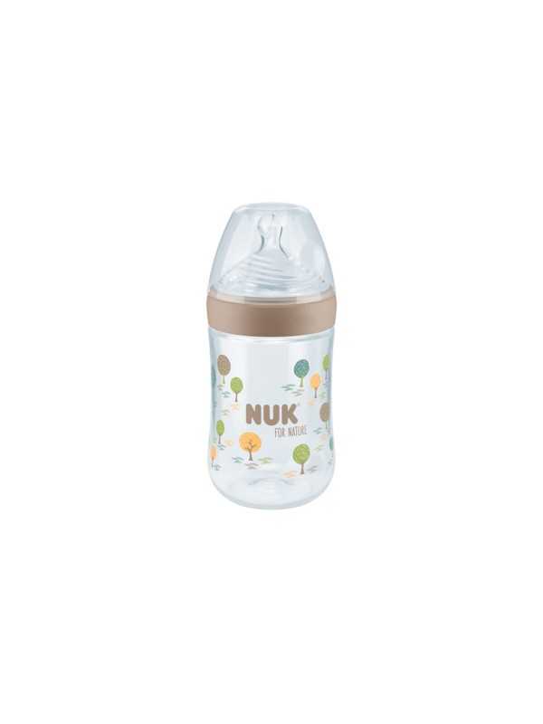 NUK ha desarrollado los nuevos biberones NUK for Nature fabricado con materiales 100% sostenbiles. La tetina dispone de múltiples orificios finos similares a los conductos mamarios, que proporcionan un flujo natural como en la lactancia materna. Además, la punta es extra suave y particularmente flexible, que hace que se adapte ella misma al paladar del bebé de una manera similar al pezón materno. Finalmente, el innovador sistema Anti Cólicos NUK permite una toma sin pausas, evita la ingestión de aire y previene los cólicos. El material utilizado es suave, dando esa sensación familiar a los labios del bebé. El indicador de control de temperatura incorporado cambia de color cuando la comida está demasiado caliente. El indicador normalmente azul se vuelve blanco. Tetina de silicona para bebés (para líquidos como agua, infusiones o leche materna). Capacidad 260ml. Sin Bisfenol A.