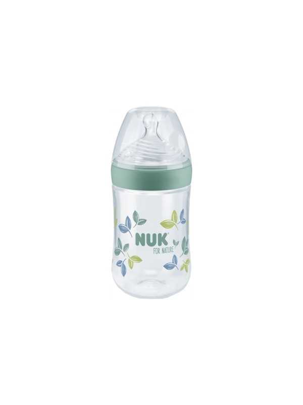 NUK ha desarrollado los nuevos biberones NUK for Nature fabricado con materiales 100% sostenbiles. La tetina dispone de múltiples orificios finos similares a los conductos mamarios, que proporcionan un flujo natural como en la lactancia materna. Además, la punta es extra suave y particularmente flexible, que hace que se adapte ella misma al paladar del bebé de una manera similar al pezón materno. Finalmente, el innovador sistema Anti Cólicos NUK permite una toma sin pausas, evita la ingestión de aire y previene los cólicos. El material utilizado es suave, dando esa sensación familiar a los labios del bebé. El indicador de control de temperatura incorporado cambia de color cuando la comida está demasiado caliente. El indicador normalmente azul se vuelve blanco. Tetina de silicona para bebés (para líquidos como agua, infusiones o leche materna). Capacidad 260ml. Sin Bisfenol A.