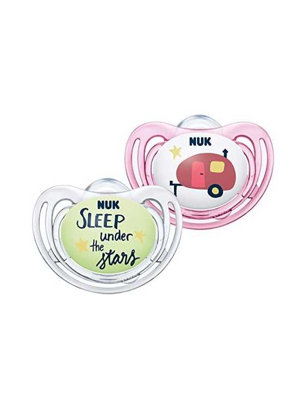 Nuk Chupete Hello Adventure Silicona, que se presenta en caja portachupetes higienizable con 2 unidades, tiene un escudo que cubre la boca con forma ergonómica y con orificios para minimizar el contacto con la piel del bebé.