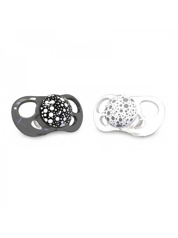 Set formado por dos chupetes de silicona en color blanco y negro para bebés desde el nacimiento hasta los 6 meses