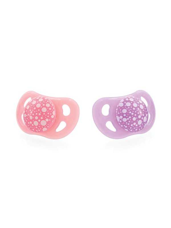 Set formado por dos chupetes de silicona en color rosa y lila pastel para bebés desde el nacimiento hasta los 6 meses
