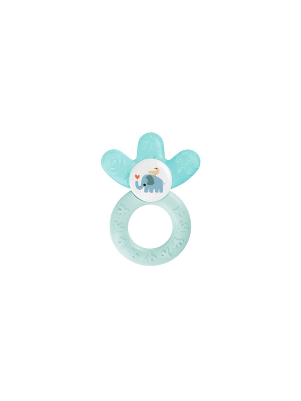 Mordedor con parte refrescante rellena de agua. Masajea las encías sensibles. Forma curva fácil de agarrar y sostener.