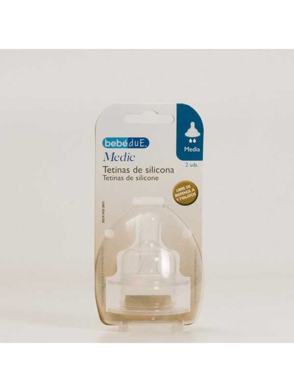 Este envase contiene 2 tetinas de silicona de flujo medio BebéDue.