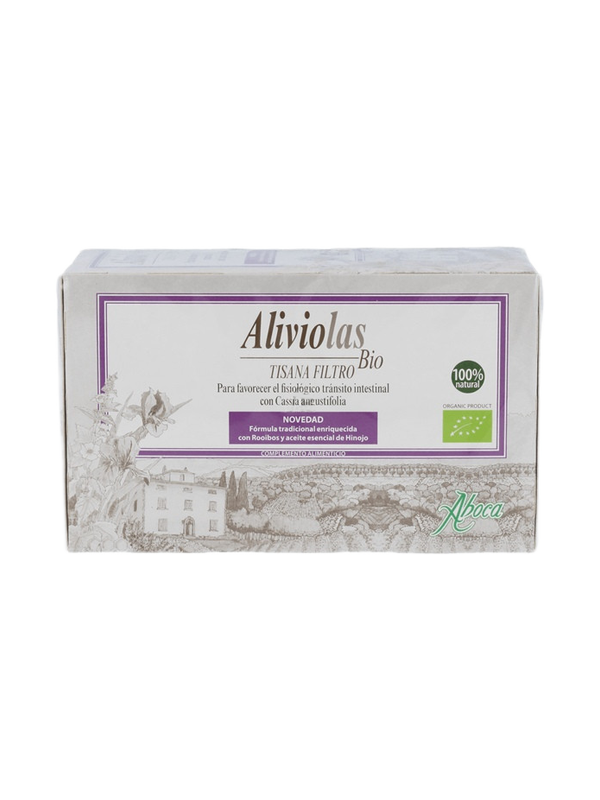 Aliviolas Bio Tisana resulta útil para favorecer el tránsito intestinal fisiológico gracias a la presencia de fitocomplejos de: 1) Sen, que ejerce una acción específica en el tránsito; 2) Hinojo y Alcaravea, que favorecen la eliminación de los gases intestinales; 3) Malva, Melisa y Regaliz, que ayudan a los procesos fisiológicos digestivos.