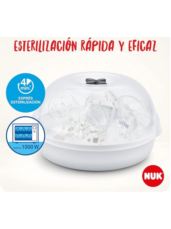 NUK Micro Express Plus esterilizador de biberones para microondas | Esteriliza hasta 4 biberones y accesorios en 4 minutos |Apto para la mayoría de los microondas |Pinzas para una extracción higiénica