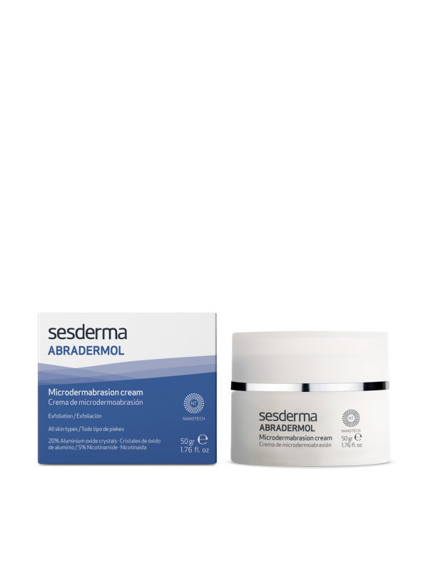 Abradermol Crema Microdermoabrasión con cristales de óxido de aluminio. Estos cristales producen una abrasión de las capas epidérmicas superiores y exfolian las células muertas, eliminando las impurezas de la piel y estimulando la renovación celular incrementando la producción de colágeno y con ello la elasticidad.