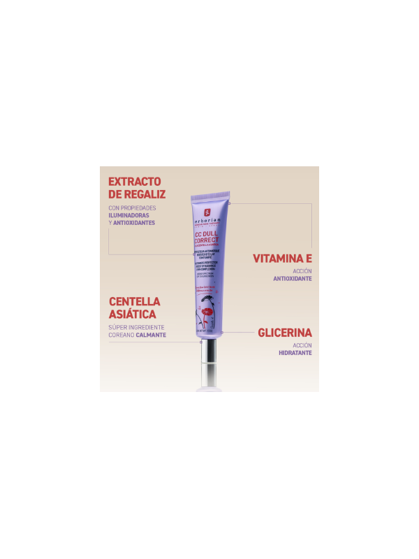 CC DULL CORRECT está enriquecida con extracto de Regaliz, conocido tanto por sus propiedades iluminadoras y antioxidantes como por su capacidad para neutralizar los efectos de los radicales libres.
