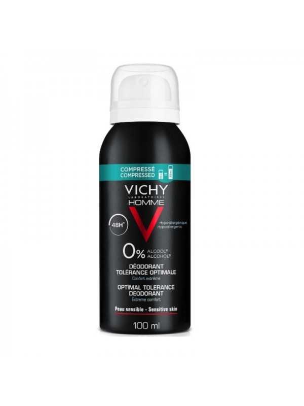 El desodorante en spray par ahombres de tolerancia óptima de vichy es hipoalergénico, de 48 horas de duración con 0% de alcohol y envase reciclable ecocomprimido. Con un 32% menos de envase, los 100ml de producto comprimido proporciona la misma eficacia de uso que un spray de 200ml.