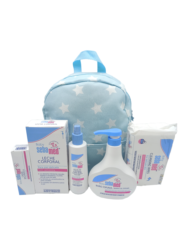 Mochila ideal para el cuidado del bebé en color azul que contiene: Sebamed Baby Baño Espuma 500 Ml, Sebamed Baby Leche Corporal 400 Ml, Sebamed Baby Agua De Colonia 250 Ml, Sebamed Baby Crema Balsamica 50 Ml, Sebamed Toallitas Limpiadoras Suaves 72 Unidades.
