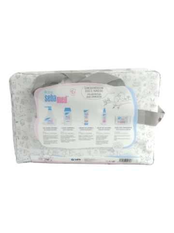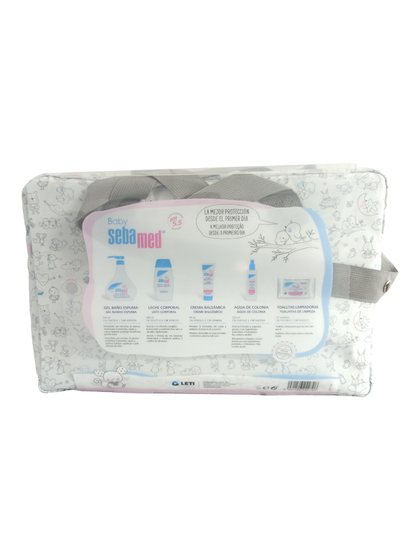 Se trata de una práctica canastilla de productos para el cuidado de la piel del bebé junto con un bolso de transporte que incluye: un gel de baño de espuma que ayuda a calmar, hidratar y proteger la delicada piel del bebé, leche corporal gracias a su eficiente complejo humectante y emoliente hace que se absorba rápidamente, crema balsámica que previene la dermatitis del pañal y estimula el proceso de curación, agua de colonia que evita la irritación y sequedad gracias a sus ingredientes protectores e hidratantes sin alcohol y toallitas limpiadoras ultrasuaves para la zona del pañal.