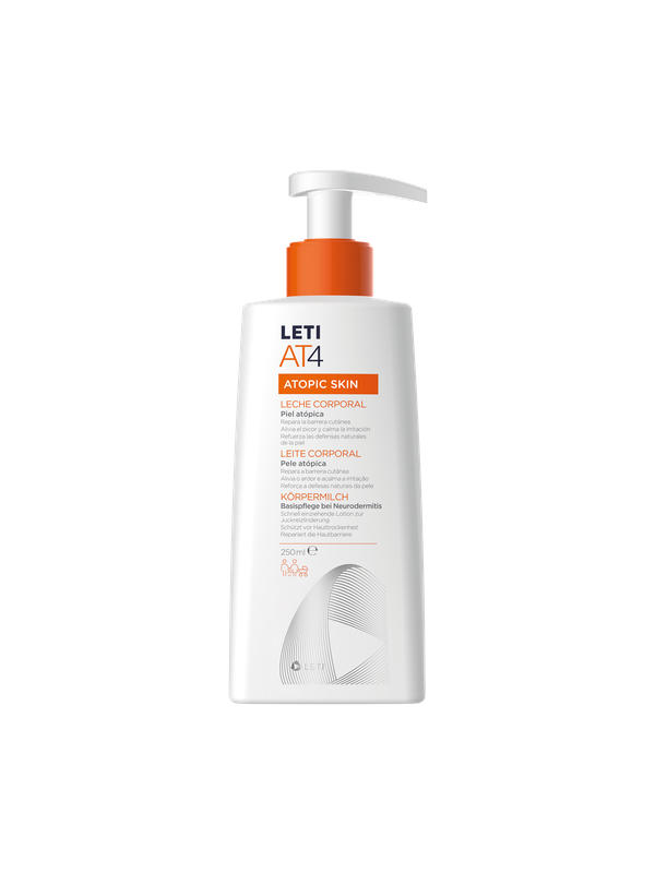 Leti AT4 Leche corporal es una fórmula específica para el cuidado diario de la piel atópica, que actúa como coadyuvante en el tratamiento en el tratamiento de estos 4 signos: sequedad, picor, irritación y riesgo de sobreinfección. Tiene una textura fluída (no grasa) de absorción rápida. Aporta los lípidos fundamentales de la barrera cutánea como son las ceramidas y ácidos grasos omega 6. Con polidocanol que alivia el prurito.