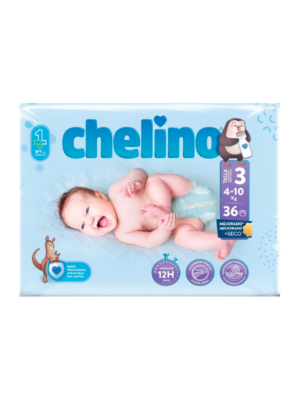 Pañales Chelino Talla 3 son la solución ideal para bebés que pesan entre 4 y 10 kg. Es un pañal ergonómico con bandas laterales muy elásticas para que se adapte a la perfección al cuerpo del pequeño que, junto a su doble sistema de seguridad, evita todo tipo de escapes.