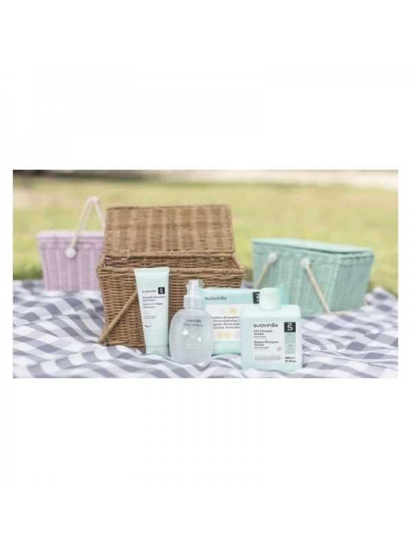 Cesta de primeros cuidados de Suavinex que incluye: Gel-Champú Syndet 300 ml, Pomada Intensiva del Pañal 75 ml, Baby Colonia, Toallitas Dermohidratantes 25 Unidades.
