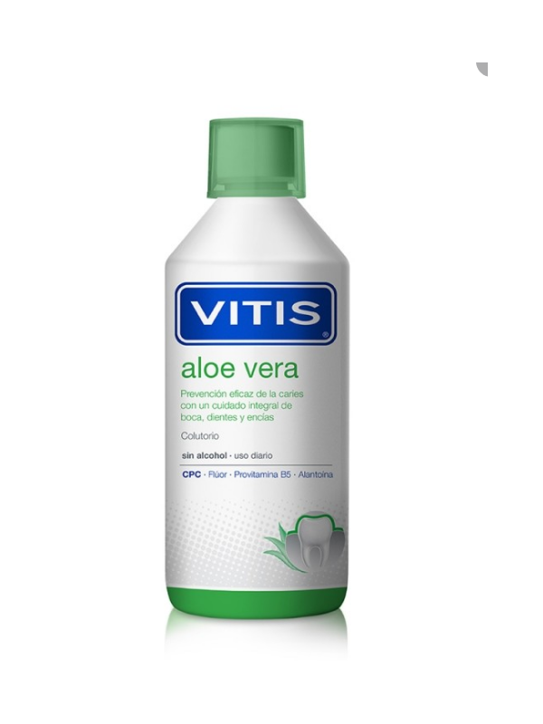 VITIS® aloe vera colutorio sabor menta es un enjuague bucal de uso diario, formulado especialmente para prevenir la caries, ya que reduce eficazmente el biofilm oral bucal (placa bacteriana), ayuda a cuidar de forma integral la cavidad bucal y posee una acción antioxidante y remineralizante del esmalte.