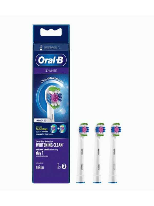 Recambio cepillo eléctrico Oral B 3D White 3 unidades Recambio cepillo eléctrico Oral B 3D White 3 unidades: Inspirado en las herramientas profesionales, el cabezal 3DWhite está diseñado para limpiar diente por diente. Presenta una pieza pulidora de diseño especial que ayuda a eliminar las manchas en la superficie mientras que los filamentos eliminan la placa, lo cual proporciona un resultado ideal para conseguir una limpieza y blanqueamiento superiores. También es capaz de blanquear los dientes en dos semanas eliminando las manchas en la superficie.