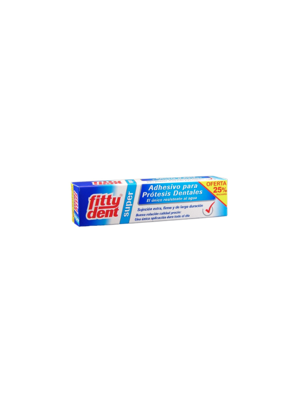 Fittydent super adhesivo 40 g+25% dto: Fuerte fijación que dura hasta 12 horas evitando rozadura y desplazamientos, favoreciendo así que la mucosa no se irrite y que se acumulen residuos. Se aconseja limpiar la boca antes de usarla, poner un poco de cantidad de producto sobre la prótesis hacer un proco de presión durante unos segundos. Esperar 15 minutos antes de comer o beber.