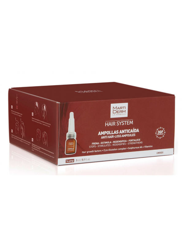 Hair System es un tratamiento tópico de innovación biotecnológica para ayudar a frenar la caída del cabello y estimular su crecimiento gracias a su complejo exclusivo de MartiDerm formado por tres factores de crecimiento capilar (IGF, VEGF y Follistatín), que actúan de manera sinérgica para favorecer la regeneración y la reparación celular y su Complejo CLA-Glutation, antioxidante, protector e hidratante.