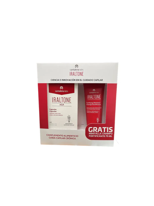 Iraltone pack Aga 60 cápsulas + champú 75 ml es un tratamiento para ayudar a prevenir la caída del cabello que se administra por vía oral y tópica. ...
