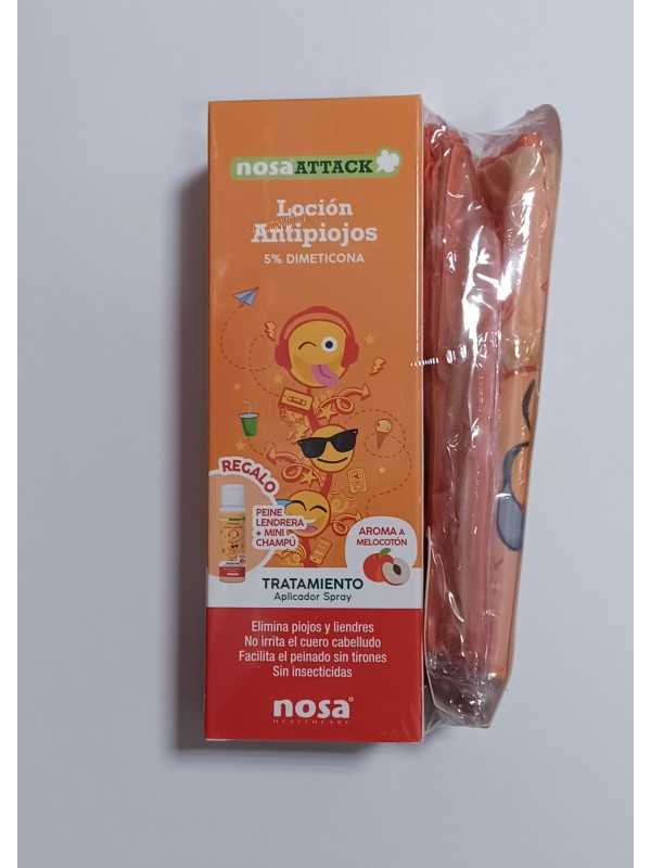 Modo de empleo: Aplicar sobre el cabello seco, desde la raíz del cuero cabelludo hasta las puntas, con suaves masajes. Repartir el producto de manera que el cabello quede cubierto por completo. Dejar actuar 1 minuto y empezar a cepillar con el peine Lendrera Nosaattack todo el cabello desde la raíz a las puntas. Se recomienda repartir el cabello en pequeños mechones y peinarlos detenidamente para asegurar un arrastre perfecto. Insistir detrás de las orejas y la nuca. Mantener el producto aplicado unos 15 minutos. Retirar el producto lavando el cabello con el champú cosmético Nosaprotect o con su champú habitual, aclarar abundantemente.