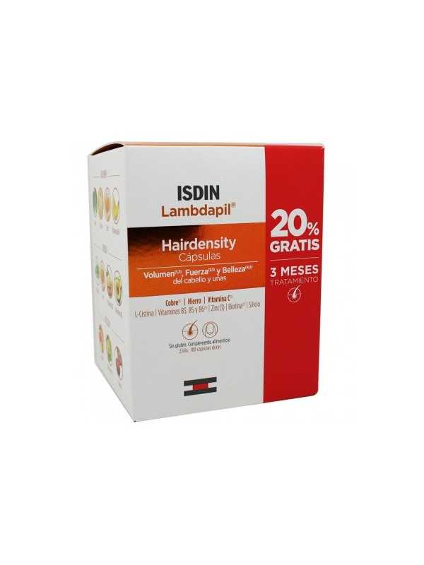 Lambdapil Hairdensity 180 capsulas es un complemento alimenticio resultado de la mezcla de varios ingredientes como Vitamina C, Vitamina B6, Biotina, L-Cistina, Cobre, Silicio, Hierro y Zinc.