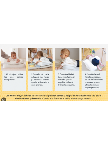 Mimos® Play es un producto que facilita la pra´ctica del Tummy Time y ayuda a la correccio´n de deformidades severas con su posicion lateral ajustable. Consta de 3 piezas para ajustarse al desarrollo y a la edad del bebe´; por lo tanto, los bebe´s pueden utilizar Mimos® Play desde las primeras semanas de vida hasta que el bebe´ aguanta sin problema 1 hora de Tummy Time/di´a.