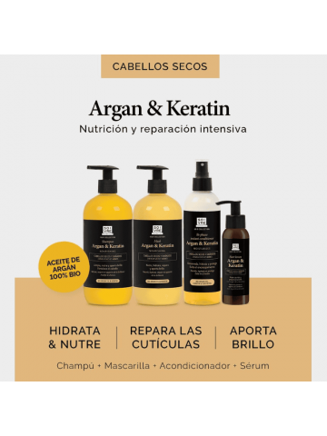 Formulado a base de una exclusiva combinación de aceite de Argán BIO y Keratina, aporta al cabello un alto contenido en Vitamina E y ácidos grasos esenciales, que aseguran nutrición, reparación y un brillo espectacular.