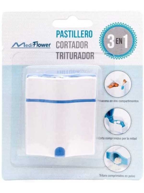 El Pastillero Medi-flower 3 en 1 sirve para cortar, triturar y almacenar comprimidos. Corta por la mitad los comprimidos, por otro lado tiene un departamento para pulverizarlos y por último almacena los medicamentos en dos compartimentos.