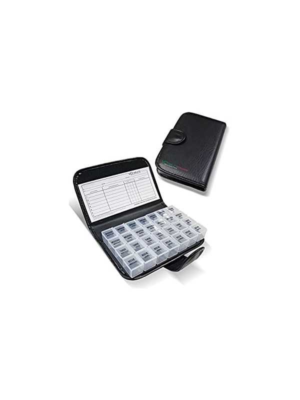 Pastillero semanal con siete bandejas extraíbles, con cuatro compartimentos cada una, para lleva en bolso o bolsillo.