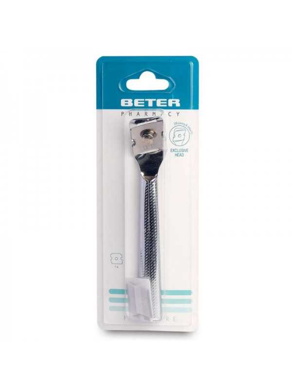 Cabezal metálico con curvatura especialmente estudiada para minimizar el peligro de corte. Elimina callos y durezas de forma eficaz.