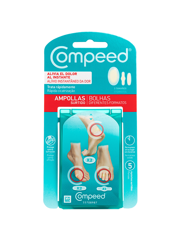 El surtido de apósitos para ampollas de COMPEED® es la mejor solución para todo tipo de ampollas en los pies. Contiene apósitos de diferentes tamaños para poder utilizar en diferentes partes del pie.