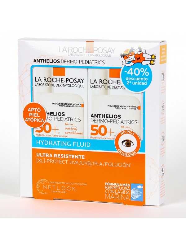 La Roche Posay Anthelios Dermopediatrics SPF50+ Fluido Hidratante ahora en un pack duplo, con un ahorro del 40% en la segunda unidad. Un protector solar que con su amplio espectro crea una barrera protectora en la piel, protegiéndola de los rayos UVA, UVB, infrarrojos y contaminación, por lo que es idóneo para todo tipo de pieles, incluso para las más sensibles y reactivas, como las pieles atópicas. Su delicada composición ha conseguido que además de proteger la piel de toda la familia de los efectos nocivos del sol, aporta un extra de hidratación consiguiendo que esté nutrida. Su textura invisible, no deja restos en la piel, y no pica en los ojos.