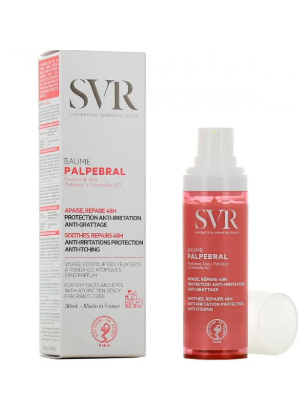 PALPEBRAL Baume hidrata y restaura la barrera cutánea y la película hidrolipídica para calmar instantáneamente y reducir de forma duradera las molestias durante 24 horas1. Rico en ácido hialurónico y Omega 3, 6 y 9 combinado con las Ceramidas patentadas AD protege contra las agresiones externas. Su textura rica y fundente es 100 % placentera y sin perfume.
