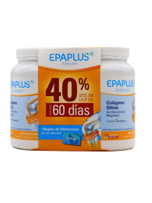 Epaplus Arthicare Mantenimiento es un complemento alimenticio que ayuda a la flexibilidad y movilidad articular por su contenido en colágeno hidrolizado, silicio (del extracto de bambú), ácido hialurónico, magnesio, vitamina C y vitaminas B1, B2 y B6.