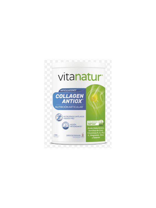 Complemento alimenticio en polvo para disolver en agua a base de colágeno hidrolizado, ácido hialurónico, extracto de semillas de uva, vitaminas A, C, D, E, magnesio, selenio y zinc. Con edulcorante.