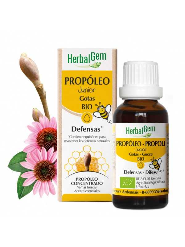 HerbalGem Propóleo Gotas Defensas Bio Junior 15ml es un concentrado indicado para niños mayores de 3 años. Ayuda a reforzar las defensas del organismo y a combatir procesos catarrales y gripales. Calma el dolor de garganta y suaviza la voz. Enriquecido con extracto de temas frescas, equinácea y aceites esenciales. Se recomienda su uso durante los meses hivernales, como preventivo de resfriados o en caso de sufrir los primeros síntomas del resfriado.
