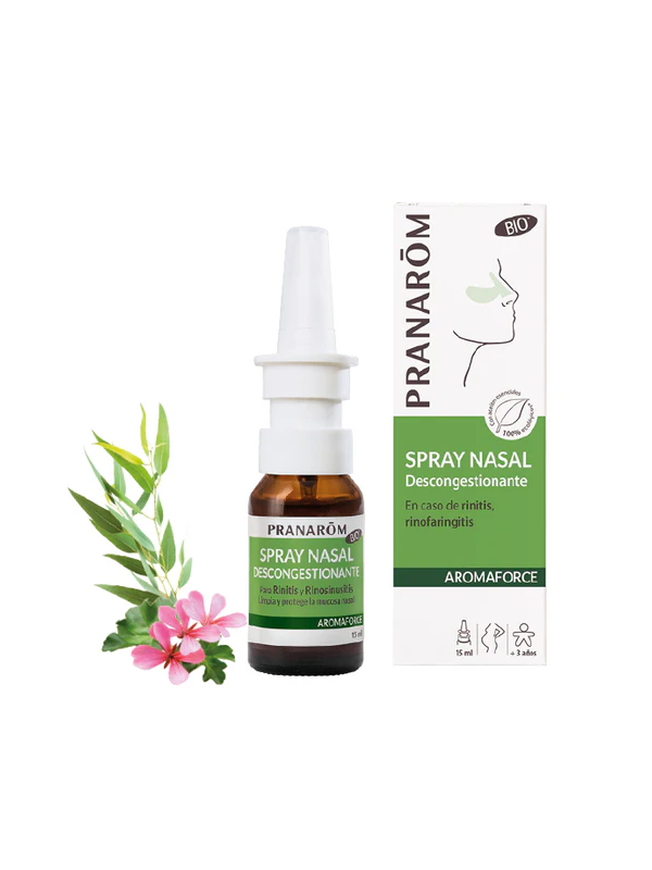 "El spray nasal Aromaforce es una solución hipertónica asociada a aceites esenciales 100% biológicos. Los aceites esenciales de mandravasarotra, de abeto negro, de eucalipto radiata y de geranio son conocidos por sus propiedades curativas, refrescantes y balsámicas.\nEste producto se utiliza en el tratamiento sintomático de la congestión nasal, como en caso de rinitis y nasofaringitis. Descongestiona y limpia la nariz al eliminar la mucosidad, fuente de contaminación bacteriana, al mismo tiempo que evita la deshidratación de la mucosa. Produce sensación de frescor gracias a la presencia de aceites esenciales.\n\nEl spray nasal Aromaforce no es adictivo."