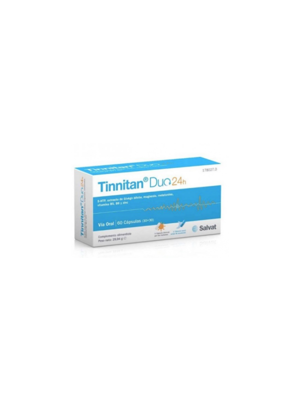 Tinnitan Duo 60 Cápsulas es un complemento alimenticio a base de 5-HTP, citrato de magnesio, extracto de Ginkgo biloba, zinc y vitamina B, indicado para el tratamiento de Tinnitus con alteración en estado de ánimo.