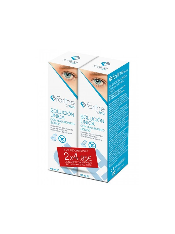 Farline Óptica Duplo Solución Única con Ácido Hialurónico (AH) 2 x 60ml es un producto diseñado para el cuidado completo de las lentes de contacto. Esta solución única limpia, desinfecta, aclara, conserva e hidrata las lentes, proporcionando una sensación de confort prolongada gracias al ácido hialurónico, que retiene la humedad y mantiene los ojos frescos e hidratados.
