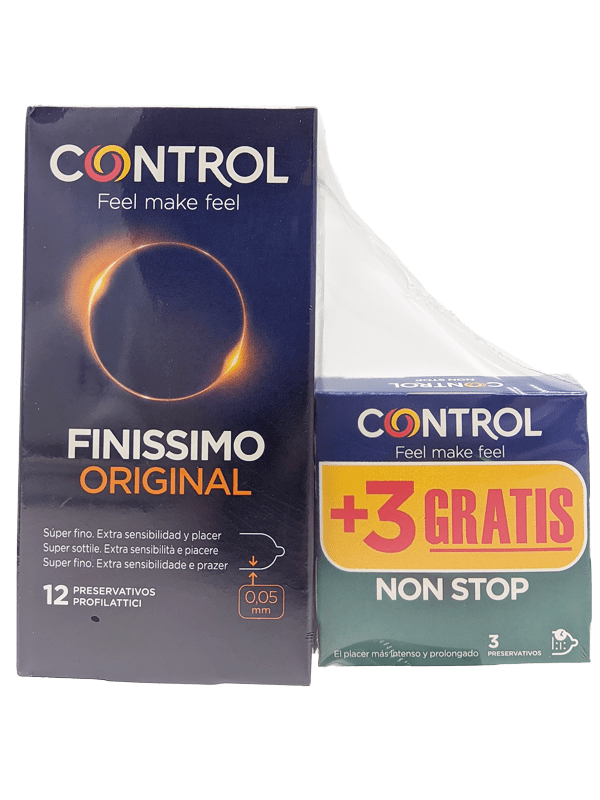 CONTROL PACK PRESERVATIVOS FINISSIMO 12 UNIDADES + 3 NON STOP GRATIS: consigue al mejor precio estos 15 preservativos y prueba el nuevo formato Non Stop, para conseguir más placer durante más tiempo.