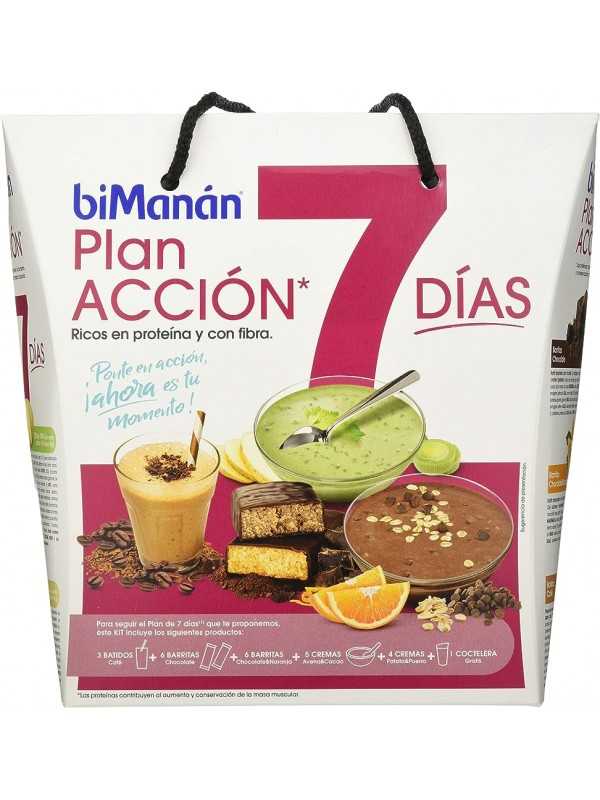 El Plan Acción 7 días de biManán combina productos biManán ricos en proteínas, con fibra, vitaminas y minerales, con alimentos de la dieta mediterránea para planificar menús de menos de 1000 kcal diarias. En el envase encontrarás las barritas, batidos y cremas biManán que necesitarás y una coctelera de regalo para preparar los batidos y cremas.